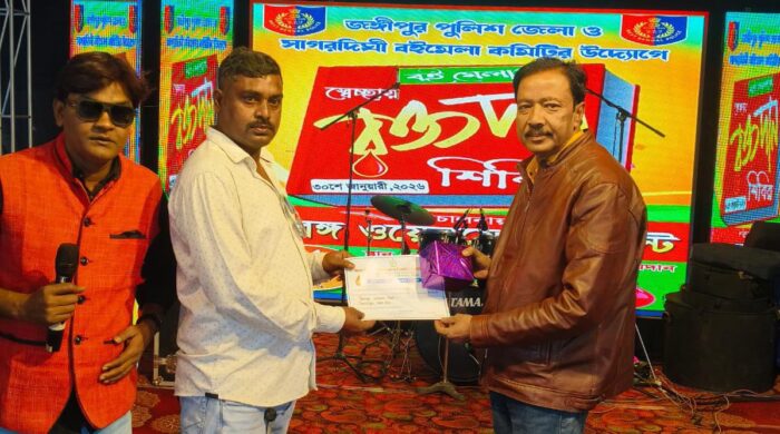 নতুন পয়গাম, রহমতুল্লাহ, সাগরদিঘী: রক্তদানের মতো মানবিক কর্মসূচির মাধ্যমে এক অনন্য দৃষ্টান্ত স্থাপন হলো সাগরদিঘীতে। জঙ্গিপুর পুলিশ জেলা ও সাগরদিঘী থানার উদ্যোগে এবং সাগরদিঘী বইমেলা কমিটির পরিচালনায় সোমবার শুরু হওয়া ষষ্ঠ সাগরদিঘী বইমেলার পঞ্চম দিনে এক ব্যতিক্রমী ছবি ধরা পড়ল। বইমেলার চত্বরেই অনুষ্ঠিত হলো এক রক্তদান শিবির। জানা গেছে, সাগরদিঘীর স্বেচ্ছাসেবী সংগঠন তরঙ্গ ওয়েলফেয়ার ট্রাস্ট-এর উদ্যোগে এই রক্তদান শিবিরের আয়োজন করা হয়। বই ও সংস্কৃতির উৎসবের পাশাপাশি সমাজের মুমূর্ষু রোগীদের পাশে দাঁড়ানোর এই প্রয়াসকে স্বাগত জানান বইমেলা কমিটি ও প্রশাসন। এই মানবিক উদ্যোগ দেখে সন্তোষ প্রকাশ করেন সাগরদিঘী থানার ওসি সুমিত বিশ্বাস সহ বইমেলা কমিটির সদস্যরা। তাঁরা জানান, বইমেলার মতো সাংস্কৃতিক পরিসরে এমন সামাজিক দায়বদ্ধতার কর্মসূচি সত্যিই প্রশংসনীয়। তরঙ্গ ওয়েলফেয়ার ট্রাস্টের সভাপতি ইফতিকার আলম জানান, “বইমেলায় মানুষ যেমন বই কিনে জ্ঞানার্জন করেন, তেমনই এই উৎসবের মধ্যেই আমরা মুমূর্ষু রোগীদের কথা ভেবে রক্তদান শিবিরের আয়োজন করেছি।” তিনি আরও জানান, এদিনের শিবিরে ১৪ জন মহিলা সহ মোট ৬৩ জন স্বেচ্ছায় রক্তদান করেন। বইয়ের সঙ্গে মানবিকতার এই মেলবন্ধন সাগরদিঘী বইমেলাকে আরও একধাপ উচ্চতায় পৌঁছে দিল বলে মত সাধারণ দর্শনার্থীদেরও।