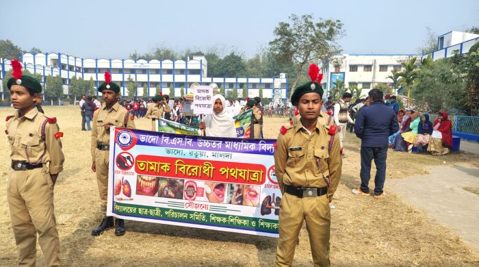 নতুন পয়গাম, রতুয়া: মালদার রতুয়া-১ ব্লকের ভাদো বিএসবি হাই স্কুলের উদ্যোগে শনিবার ছাত্র সপ্তাহ – ২০২৬ এর দ্বিতীয় দিনে পালিত হলো তামাক বিরোধী পযাত্রা। এদিনের পদযাত্রায় ছাত্রছাত্রীদের সঙ্গে পা মেলান, এলাকার বিশিষ্ট জনেরা। উপস্থিত ছিলেন পরিচালন সমিতির সভাপতি মজিবার রহমান সহ অন্যান্য সদস্যগণ।
