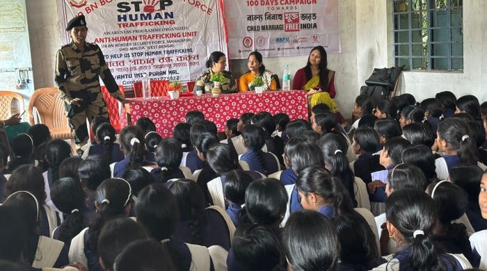 মালদা জেলার কালিয়াচক – ৩ ব্লকের বৈষ্ণবনগর শিক্ষা চক্রের রাজনগর গার্লস জুনিয়র হাই স্কুলে বুধবার এক সচেতনতামূলক কার্যক্রম অনুষ্ঠিত হয়। উক্ত কর্মসূচি ১১৯ ব্যাটেলিয়ন বর্ডার সিকিউরিটি ফোর্সের(মালদা) উদ্যোগে আয়োজন করা হয়। এদিন ‘মানব পাচার বন্ধ করুন ‘ ও ‘বাল্য বিবাহ মুক্ত ভারত ‘ বিষয়ে পড়ুয়াদের মধ্যে আলোচনা করা হয়। আলোচক হিসেবে উপস্থিত ছিলেন, ১১৯ ব্যাটেলিয়ন বর্ডার সিকিউরিটি ফোর্সের সাব ইন্সপেক্টর জেনাব পারভিন, কনস্টেবল প্রিয়াঙ্কা দাস,শক্তি বাহিনির বিদিশা পারভিন,শক্তি বাহিনির কাউন্সেলর আবৃতি সাহা প্রমুখ। আলোচকদের আলোচনায় মানব পাচার বন্ধ করতে সকলের সচেতনতা বৃদ্ধির বিষয়ে গুরুত্ব আরোপ করেন। সামাজিক যোগাযোগ মাধ্যমে সম্পর্কের সূত্র ধরে মানব পাচারের মতো অপরাধ সংঘটিত হচ্ছে। ছাত্রীদের এই বিষয়ে সতর্ক থাকতে হবে। সেইসঙ্গে বাল্য বিবাহ প্রতিরোধ করতে শিক্ষার প্রসারে জোর দেওয়া হয়। সমাজে বাল্য বিবাহের প্রচলন এখনও রয়েছে। বাল্য বিবাহ প্রতিরোধ করতে প্রথমে অভিভাবকদের সচেতন করা প্রয়োজন। সকল শিশুকে শিক্ষার অঙ্গনে নিয়ে এসে তাদের উজ্জ্বল ভবিষ্যত গড়ে তুলতে হবে। এদিনের কর্মসূচির মাধ্যমে স্কুলের ছাত্রীদের এই বিষয়ে সচেতন করা হয়।