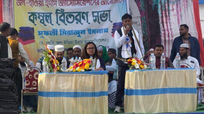 নতুন পয়গাম, সেখ সামসুল, বীরভূম: শীতের মরসুমে দুস্থ মানুষদের পাশে দাঁড়াতে বীরভূম জেলা পুলিশের তত্ত্বাবধানে এবং অল ইন্ডিয়া ইমাম অ্যাসোসিয়েশনের সহযোগিতায় ময়ূরেশ্বর থানার অন্তর্গত বিভিন্ন গ্রামে কম্বল বিতরণ কর্মসূচি অনুষ্ঠিত হলো। মুফতী সিরাজুল ইসলাম সাহেবের সভাপতিত্বে এই কর্মসূচির মাধ্যমে ময়ূরেশ্বর থানার আওতাধীন ২৩টি গ্রামের প্রায় বারো শত মানুষকে সুশৃঙ্খলভাবে কম্বল প্রদান করা হয়। এই অনুষ্ঠানে উপস্থিত ছিলেন সিউড়ি এসডিপিও মাননীয় গোবিন্দা শিকদার মহাশয়, ময়ূরেশ্বর থানার ওসি মাননীয়া কস্তুরি মুখার্জি চ্যাটার্জী মহাশয়া এবং ময়ূরেশ্বর ব্লকের বিডিও মাননীয় পুষ্পেন্দু সাহা মহাশয়। পাশাপাশি উপস্থিত ছিলেন অল ইন্ডিয়া ইমাম অ্যাসোসিয়েশনের রাজ্য চেয়ারম্যান ও বীরভূম জেলা সভাপতি মুফতী সিরাজুল ইসলাম সাহেব। এছাড়াও দাসপলসা গ্রাম পঞ্চায়েতের অঞ্চল সভাপতি মাননীয় জুল্লুর রহমান সাহেব, দাসপলসা গ্রাম পঞ্চায়েতের প্রধান মাননীয়া রোসোবা বেগম মহাশয়া সহ নুর আলম মহাশয়, মেহেবুব মহাশয় প্রমুখ বিশিষ্ট ব্যক্তিবর্গ কর্মসূচিতে অংশগ্রহণ করেন। এই কম্বল বিতরণ অনুষ্ঠানে হিন্দু ও মুসলিম– উভয় সম্প্রদায়ের মানুষের উপস্থিতি ছিল উল্লেখযোগ্য। সম্প্রীতি ও মানবিকতার বার্তা নিয়ে আয়োজিত এই উদ্যোগকে এলাকার মানুষ স্বাগত জানিয়েছেন।