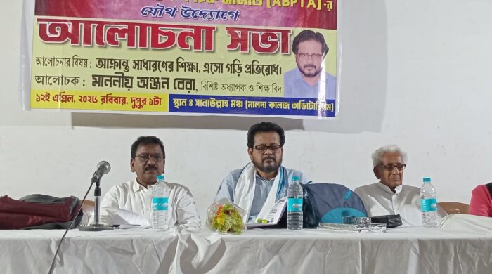 উমার ফারুক, নতুন পয়গাম, মালদা: নিখিল বঙ্গ শিক্ষক সমিতি (এবিটিএ) এবং নিখিল বঙ্গ প্রাথমিক শিক্ষক সমিতির(এ বি পি টি এ) যৌথ উদ্যোগে “আক্রান্ত সাধারণের শিক্ষা,এসো গড়ি প্রতিরোধ” শীর্ষক একটি গুরুত্বপূর্ণ আলোচনা সভা রবিবার অনুষ্ঠিত হয় মালদা কলেজ অডিটোরিয়ামের সানাউল্লাহ মঞ্চে । উক্ত সভায় মুখ্য আলোচক হিসেবে উপস্থিত ছিলেন বিশিষ্ট অধ্যাপক ও শিক্ষাবিদ অঞ্জন বেরা। আলোচনা সভায় উপস্থিত ছিলেন দুই সংগঠনের সদস্যবৃন্দ সহ সাধারণ শিক্ষক-শিক্ষিকা-শিক্ষাকর্মি ও শিক্ষানুরাগী ব্যক্তিবর্গ। সভায় সভাপতিত্ব করেন সৈয়দ কাজিম আলী ও সুকান্ত সিকদার। সভা সূচনার পূর্বে প্রখ্যাত সংগীত শিল্পী আশা ভোঁসলে ,অভিনেতা রাহুল বন্দ্যোপাধ্যায় সহ যারা প্রয়াত হয়েছেন তাদের সকলের প্রতি শ্রদ্ধা জানিয়ে নীরবতা পালন করা হয় ।