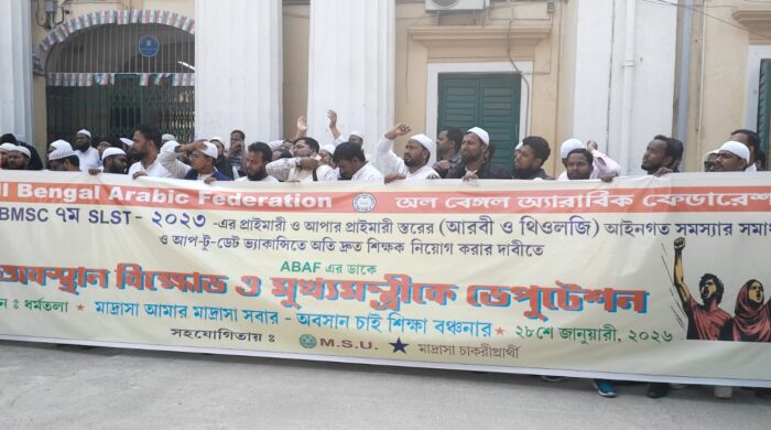 নতুন পয়গাম, কলকাতা: আরবি ও অ্যাডভান্সড আরবি শিক্ষক নিয়োগ প্রক্রিয়ায় সরকারি টালবাহানার প্রতিবাদের মাদ্রাসা চাকরিপ্রার্থীদের সংগঠন অল বেঙ্গল আরাবিক ফেডারেশন (ABAF) তাঁদের দাবি-দাওয়া নিয়ে লাগাতার আন্দোলন চালিয়ে সরকারের দৃষ্টি আকর্ষণের চেষ্টা করছে। মাদ্রাসা সার্ভিস কমিশন তাঁদের একাধিকবার প্রতিশ্রুতি দিলেও আজও কোন সমাধান মেলেনি। এই নিয়োগ জটিলতার প্রধান কারণ– টেট-এ নেগেটিভ মার্ক, পার্সুয়িং বিএড সংক্রান্ত কলকাতা হাইকোর্টে দুটি মামলা চলমান। একেরপর এক হেয়ারিং এর ডেট পিছানো হচ্ছে, ফলে নিয়োগ প্রক্রিয়া বিলম্বিত হচ্ছে। চাকরি প্রার্থীদের অভিযোগ কমিশন ইচ্ছা করে নিয়োগ বিলম্বিত করছে, কারণ কমিশন হেয়ারিং এ নিয়মিত উপস্থিত হয়না। সব মিলিয়ে চাকরিপ্রার্থীরা ক্ষোভে ফেটে পড়েছেন। বঞ্চনার অভিযোগ তুলে ধারাবাহিকভাবে কলকাতায় আন্দোলনে নামছে তাঁরা।