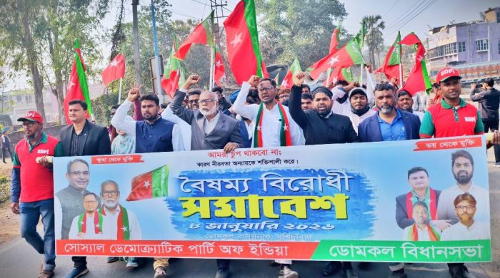 নতুন পয়গাম, এম. আহমেদ, ডোমকল: সমাজের সর্বস্তরে চলমান সামাজিক, অর্থনৈতিক ও রাজনৈতিক বৈষম্যের বিরুদ্ধে প্রতিবাদ জানিয়ে বৃহস্পতিবার, ৮ জানুয়ারি ২০২৬ ডোমকল বাসস্ট্যান্ডে অনুষ্ঠিত হলো সোশ্যাল ডেমোক্র্যাটিক পার্টি অব ইন্ডিয়া (SDPI)-এর বৈষম্যবিরোধী সমাবেশ। এই উপলক্ষে ডোমকল কুঠিরমোড় থেকে ডোমকল বাসস্ট্যান্ড পর্যন্ত এক বিশাল পদযাত্রার আয়োজন করা হয়। পদযাত্রা শেষে বাসস্ট্যান্ডে আয়োজিত সমাবেশে রাজ্য, জেলা ও বিধানসভা স্তরের একাধিক নেতৃত্ব উপস্থিত ছিলেন। সমাবেশে হাজার হাজার মানুষের স্বতঃস্ফূর্ত অংশগ্রহণ লক্ষ্য করা যায়। সমাবেশে বক্তারা শিক্ষা, স্বাস্থ্য, কর্মসংস্থান এবং সরকারি পরিষেবায় বিদ্যমান বৈষম্যের বিরুদ্ধে তীব্র প্রতিবাদ জানান। রাজ্য সভাপতি হাকিকুল ইসলাম তাঁর বক্তব্যে বলেন, মিড-ডে মিলের খাবার পরিবেশনে বৈষম্য এবং বাংলাভাষী পরিযায়ী শ্রমিকদের ওপর নিগ্রহের ঘটনা বিভাজনের রাজনীতির নগ্ন উদাহরণ। তিনি সরকারি চাকরি ও শিক্ষাক্ষেত্রে সংখ্যালঘুদের অংশগ্রহণ ক্রমশ কমে যাওয়ার বিষয়টিও তুলে ধরেন।